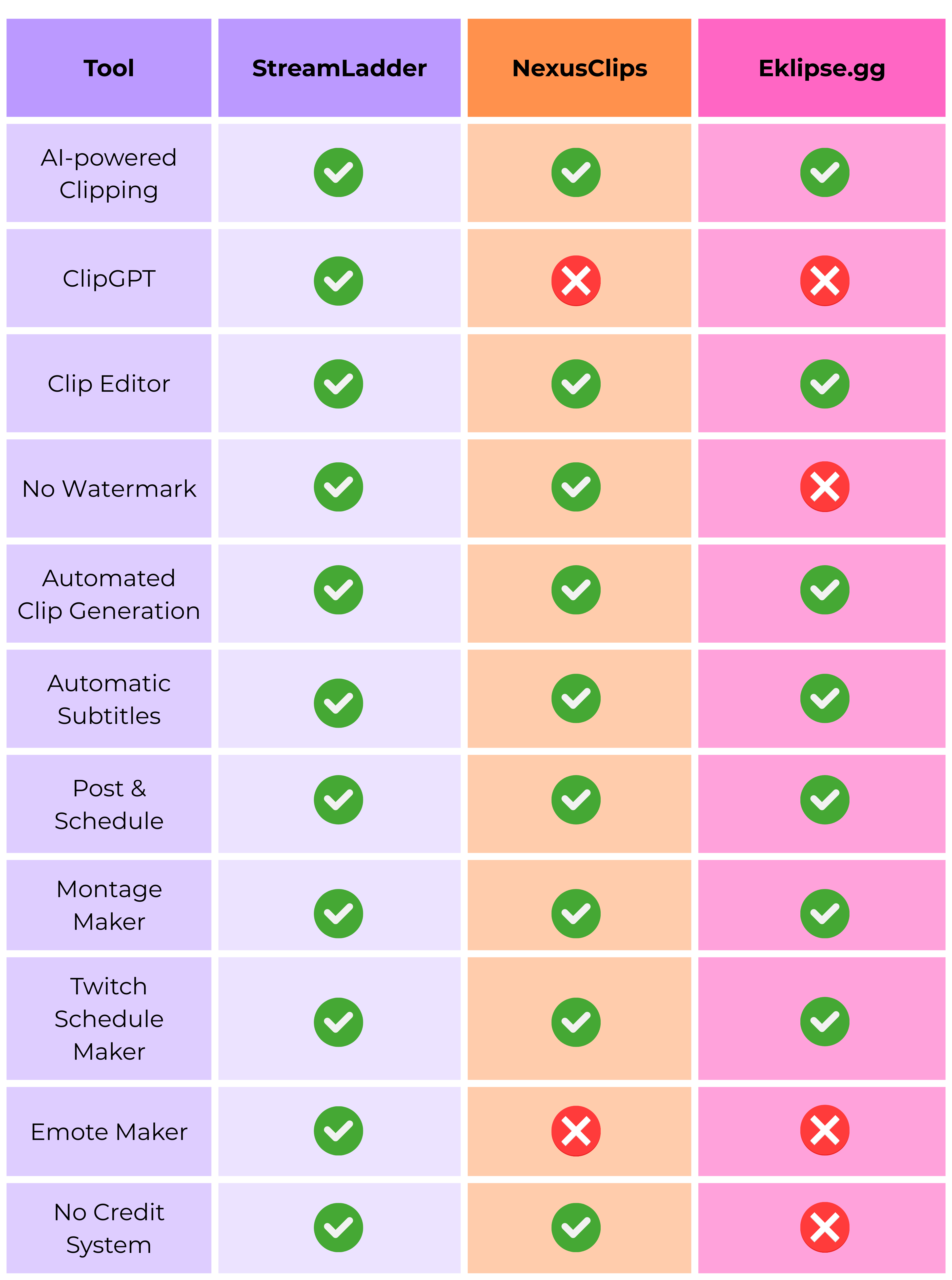 All three tools help transform livestreams into short-form content, and each serves a slightly different type of creator. Eklipse.gg shines in fast, hands-off publishing. NexusClips offers an easy starting point for experimentation. StreamLadder, however, brings together automation, performance insights, and creative control in one platform. Out of 11 tools we compared StreamLadder offered the highest diversity of different tools for creators.