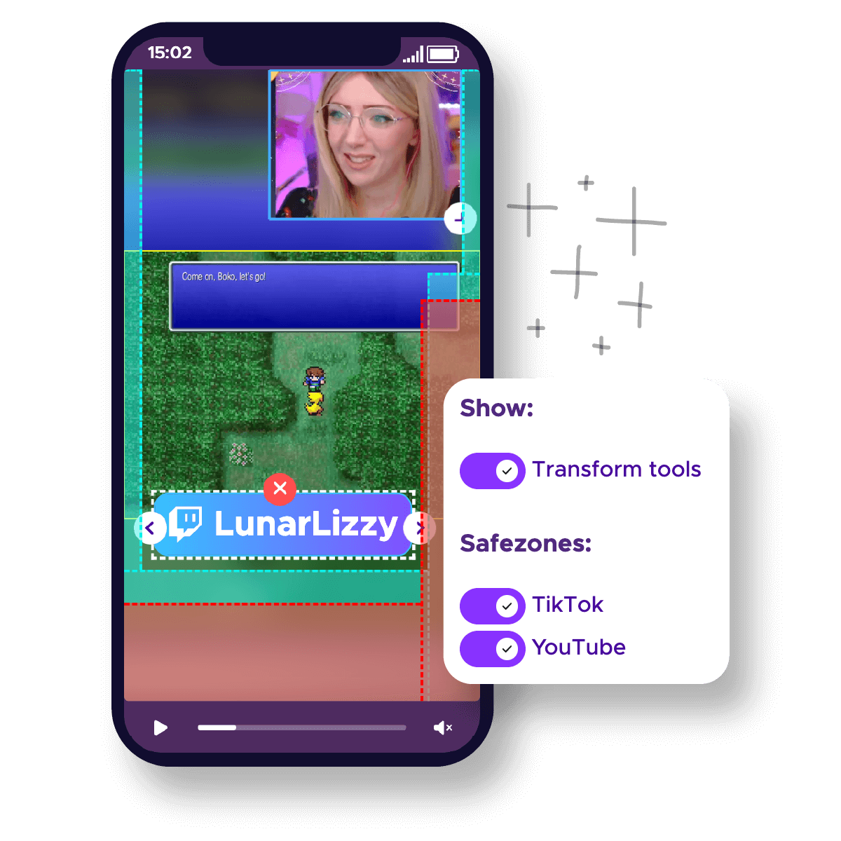 Select the areas of the Twitch clip you want to use in your TikTok video: your gamefeed and possibly the facecam and game interface. This is also where you can edit the clip to make it shorter by using the slider at the bottom of the screen.