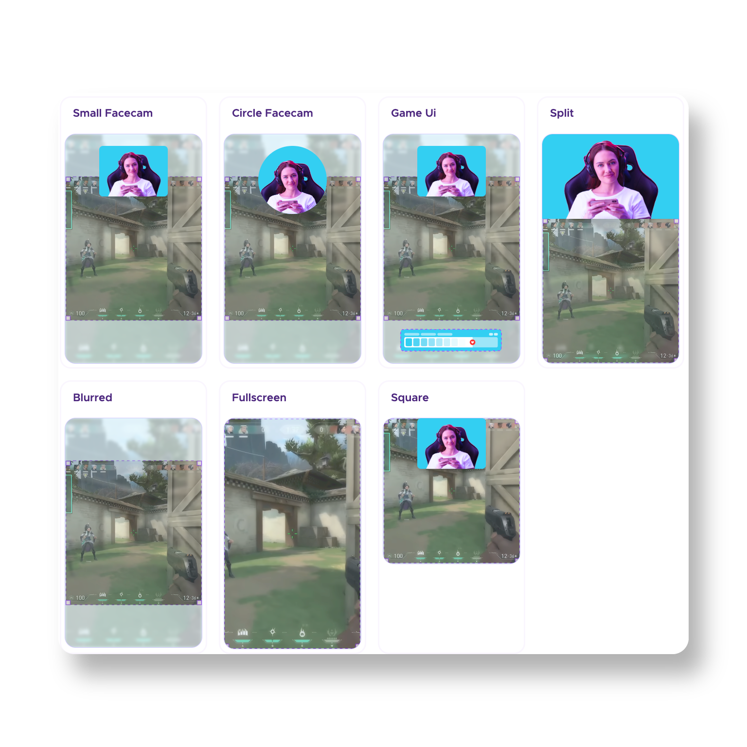 Now you can start editing your Twitch clip. First, select a layout by choosing one of the options in our library. There are options with and without a face cam and there's also an option to show the interface of the game. Pick the one that suits your video best.